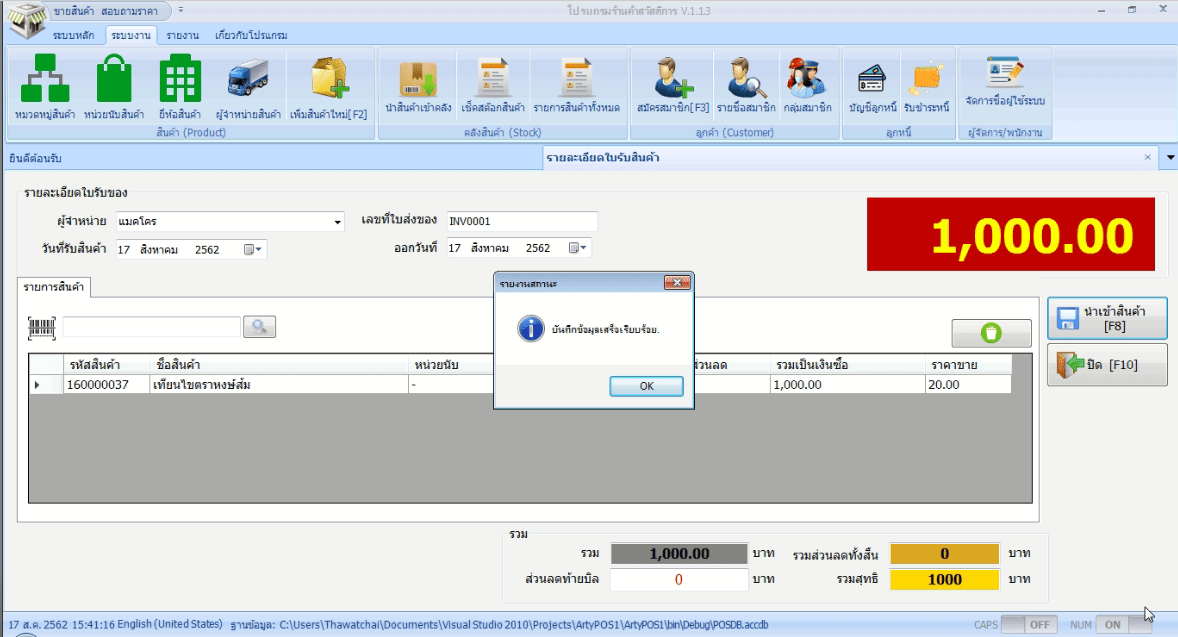 เพียงเท่านี้ก็เป็นอันเสร็จสิ้นขั้นตอนการนำสินค้าเข้าคลัง ทำเช่นเดียวกันนี้ทุกครั้งที่สั่งซื้อสินค้าเข้าร้านใหม่ หากรายการสินค้าไหนที่ร้านยังไม่เคยมีในระบบ จะต้องไปเพิ่มสินค้าใหม่ที่เมนู เพิ่มสินค้าใหม่ก่อน